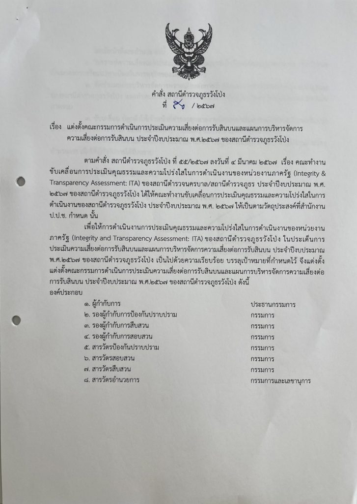 คำสั่งแต่งตั้งคณะกรรมการมาตรการส่งเสริม คุณธรรมและความโปร่งใส